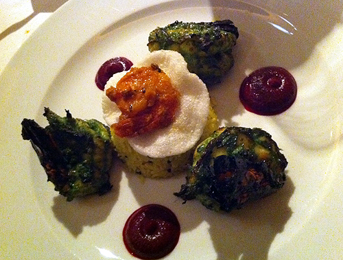 We were welcomed by a glass of champagne and given the menus, while also enjoying some crispy mini poppadums and yummi dips. I promptly spilled some of the best one on the white linen, in my eagerness to munch on the them. Embarrassing. The menu here has some variations on Indian classics such as tandoori and murgh dishes, using staples not usually seen in your average Indian eaterie, and it is a pleasant change. Atul Kotchhar has certainly built a menu that has something for everyone, including my very fussy better half.