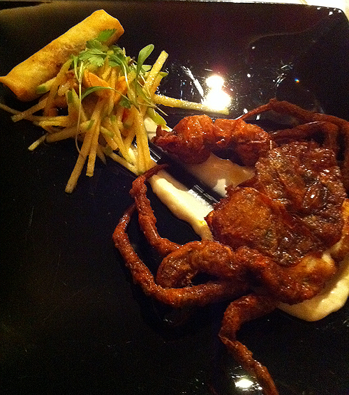 We all chose different dishes, and when the starters arrived, we peeked at each other plate in awe. I had a whole Soft shell crab with an apple and peanut salad, which was hugely better than Hakkasan’s; My sister chose Rabbit sheesh kebab with chicken liver masala and paratha, which she told us, is a bread from Kerala. Her starter was possibly the best, with an interesting mix of flavours and a beautiful masala.