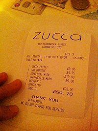 1. What a find, I will definitely try this place out on Bermondsey Street. According to your bill, the wine cost £23 (not £26). The mains were very reasonably priced at £10 and £9 though. Thanks for getting this place on my radar. Like you, I am nearly always disappointed with Italian restaurants in London unless it costs a fortune, but this seems authentic and well priced.