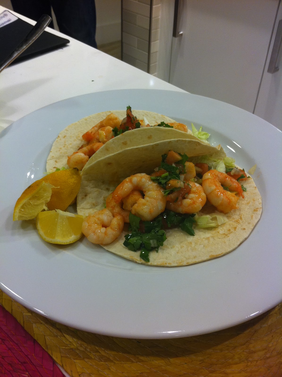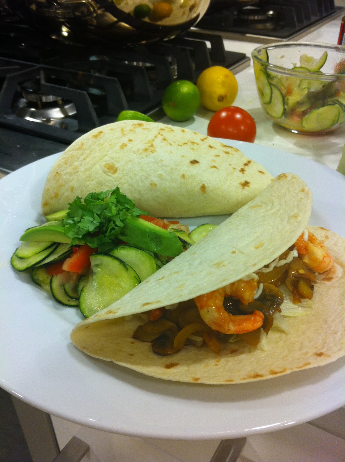 I also sauteed a yellow pepper and some mushrooms in the pan with some chipotle sauce, and then pan friend the prawn, which I had marinated with lime juice and paprika. Once I steamed the tacos, I filled them in with the prawns, the pepper and mushrooms, some shredded lettuce and a sprinkle of sour cream.