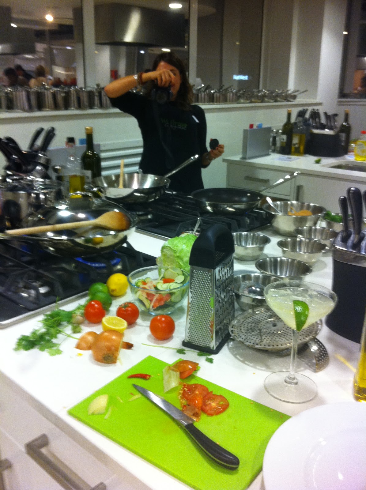 After the demo, was time for us, the tipsy bloggers, to have a go. With 30 minutes to spare, we had to come up with one or two dishes, Mexican inspired or not. We had enough to choose from… a wide array of fresh vegetables, prawns, chicken, sea bass, plus a lot of spices and some herbs. I couldn’t think too much (thanks to the Margarita of course) and I thought I should still keep within a Mexican theme. I made a fresh ‘salad’ of raw sliced courgette, fresh tomatoes, onion and chili pepper, with lemon and lime juice and chopped coriander.