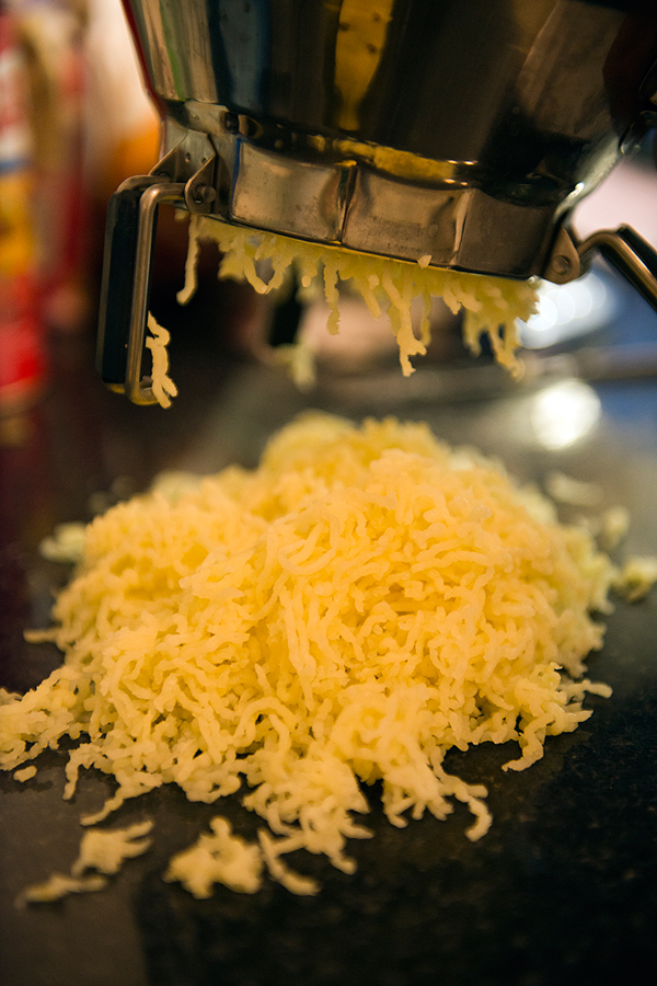 To make the gnocchi, place the potatoes in their skin in a pan of cold water, salt lightly and bring to the boil. Cook until just done (keep them still firm) and once peeled, grind them in the potato grinder onto a wide, clean surface.